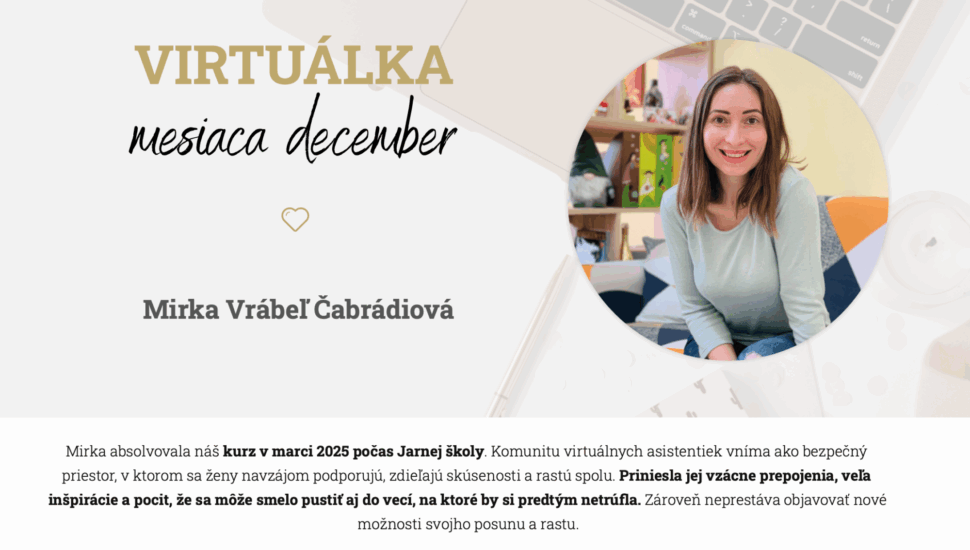 O virtuálnych asistentkách som počula už počas rodičovskej dovolenky. Páčila sa mi predstava pracovať z domu, mať flexibilný pracovný čas a pracovať toľko hodín, koľko mi vyhovuje. Absolvovala som kurz Základné zručnosti pre VA a Trojkombo, na ktorom sa kurzistky učia pracovať v systémoch Mioweb, Fapi a Smartemailing. Niki Kolesar k tomu vypracovala skvelé video materiály a viedla intenzívny tréning, aby sme si teoretické znalosti nacvičili i v praxi. Vďaka Niki Kolesar a tomuto skvelému tréningu som si našla prvú spoluprácu už počas kurzu. Som jej vďačná za všetky rady, pomoc a oporu.Vladimíra Dluhošovávirtuálna asistentka