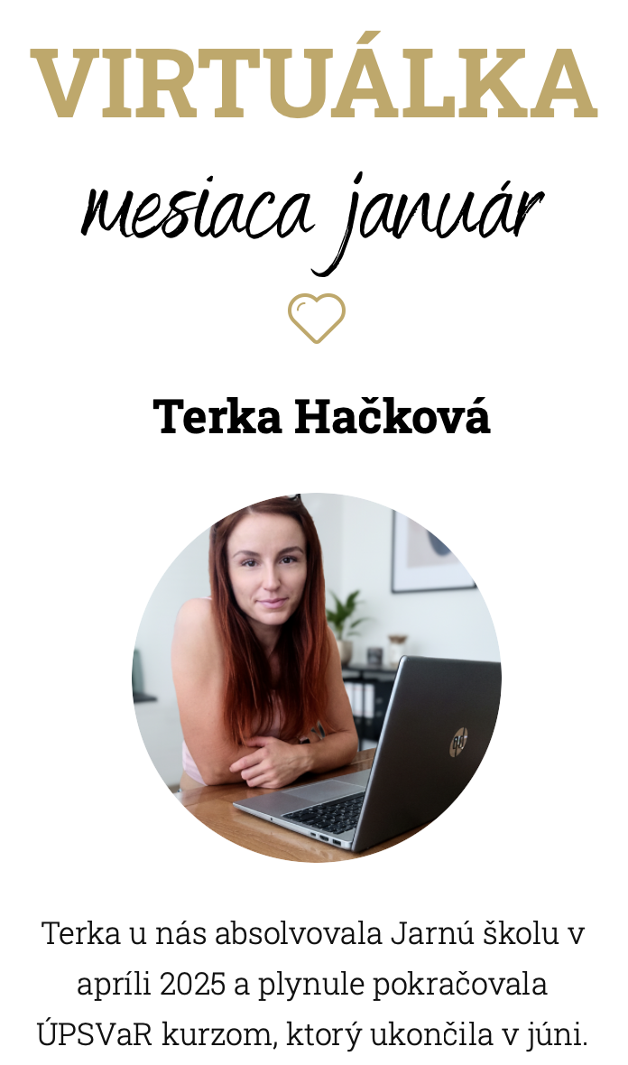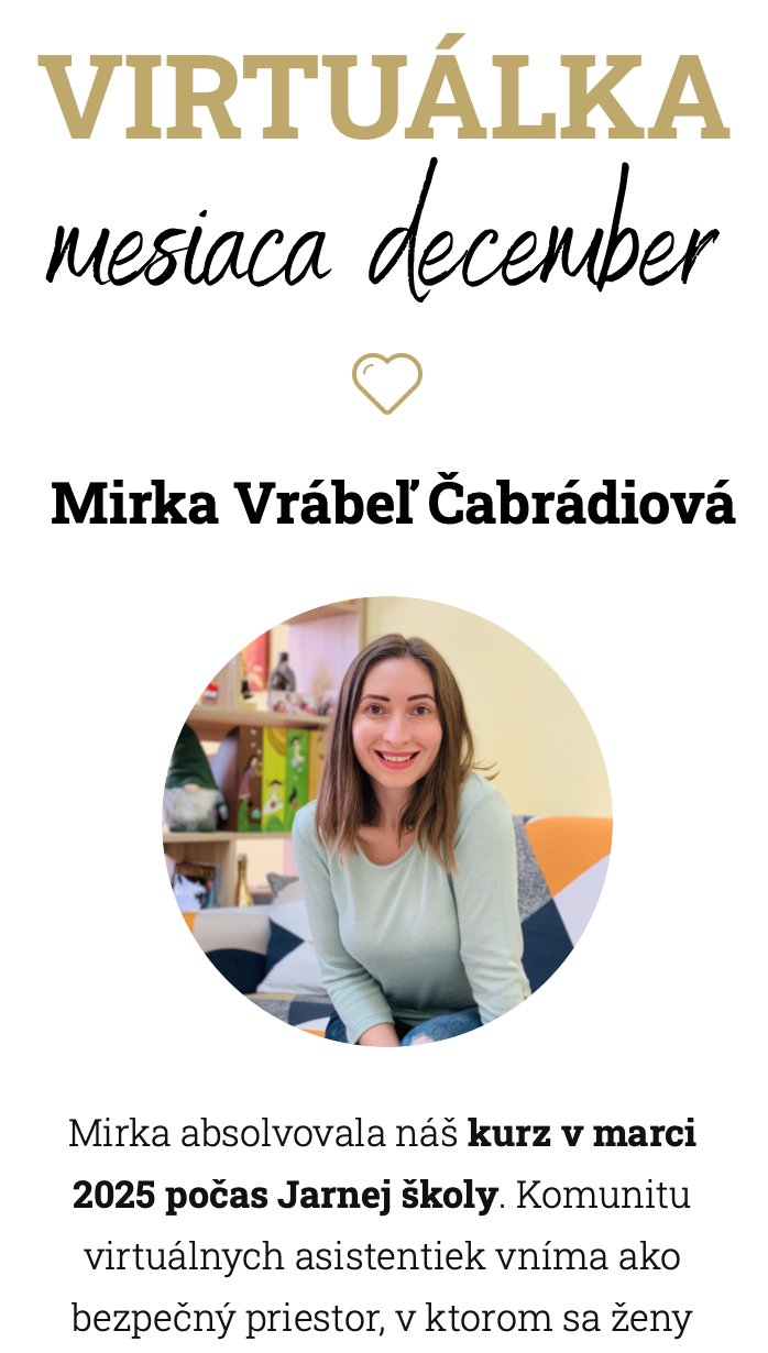 Tento kurz bol pre mňa obrovským prínosom. Spočiatku som bola nerozhodná, čakala som na ten správny okamih – na znamenie, že je čas. A ono to prišlo. Kurz si ku mne našiel cestu presne vtedy, keď som to najviac potrebovala. Pomohol mi nájsť smer, ktorým sa chcem uberať, a objaviť svoj priestor, ktorý mi robí radosť a dáva mi možnosť oddýchnuť si od každodenných materských povinností. Naučila som sa množstvo nových zručností a hoci si uvedomujem, že ma čaká ešte dlhá cesta plná učenia, nevzdávam sa. Pretože nič nie je hodnotnejšie ako spojiť príjemné s užitočným a mať pocit, že aj v pracovnej oblasti robím to, čo ma skutočne baví. Takže, ak si tu aj TY..... áno TY, ktorá stále váhaš a tvoj vnútorný hlas ťa ťahá týmto smerom, smelo do toho. Nemáš čo stratiť . 😍😍😍Mária Demeterovávirtuálna asistentka