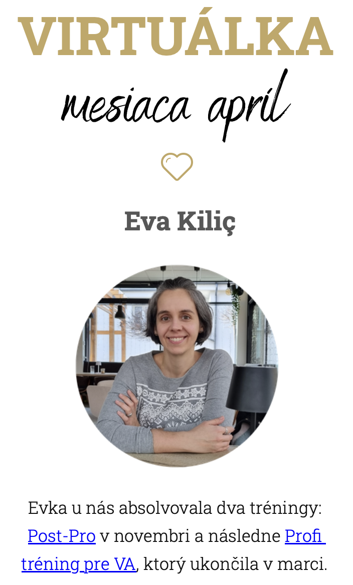 Kurzy pre virtuálne asistentky ma oslovili už dávnejšie. Na rodičovskej dovolenke som cítila potrebu získať nové vedomosti a pracovať na niečom, kde uvidím výsledky svojej práce. Absolvovala som kurzu Zručnosti pre VA a tréning pre pre profesionálne VA. Za obe skúsenosti som veľmi vďačná. Musela som na sebe zamakať, zvládnuť skĺbiť povinnosti doma spolu s každodennými zadaniami. Bola to pre mňa veľká výzva. Spolupráca s Gabi, Niki a Viki pre mňa bola veľmi obohacujúca. Určite ich odporúčam, pretože v dnešnej online dobe je potrebné neustále vzdelávanie a aj zamestnávatelia očakávajú stále viac zručností od kandidátov. Ďakujem.Monika Pažitnávirtuálna asistentka