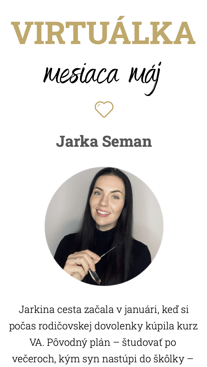 Takto pred rokom som o profesii VA ani nepočula. Hneď ma to zaujalo a s pomocou Google moje cesty viedli až k vám... Ďakujem!Anna B.absolventka kurzu