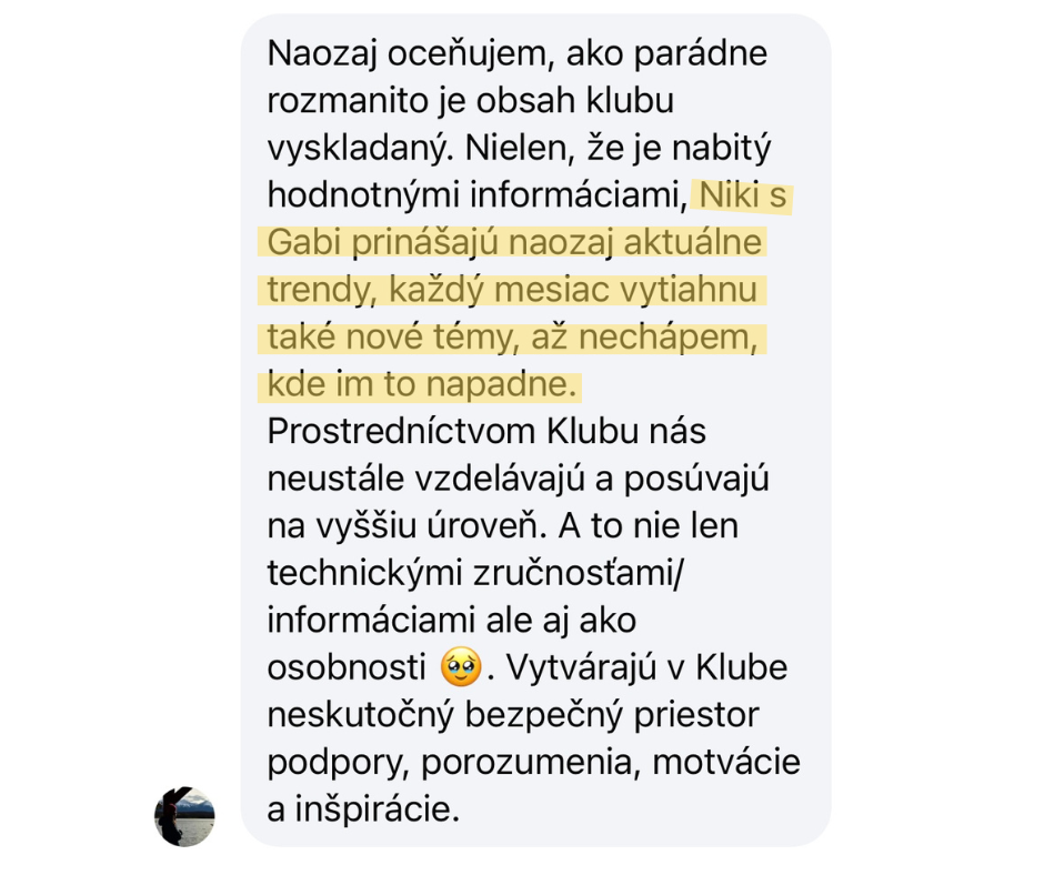 Ak máš svoj projekt, si tu správne. V Klube sa dostaneš k trendom, ktoré hýbu svetom digitálu - od marketingu až po nástroje, ktoré ti zjednodušia každodennú prácu, ale aj témy osobného rastu, ktoré sú pre sebarealizáciu nevyhnutné. Nájdeš tu ženy, ktoré podnikajú autenticky a spolu sa posúvajú ďalej.